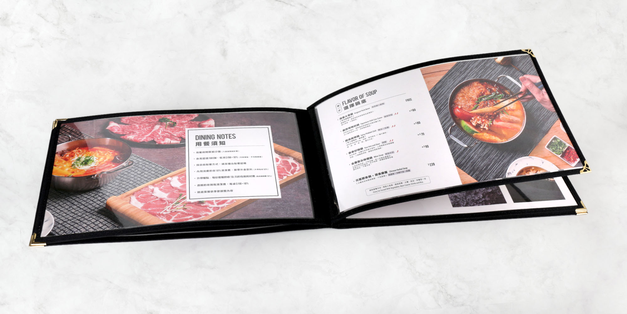 ▼頁面四邊全花角,保護力強不易毀損。 菜單頁面可平翻,設計頁面不受限。