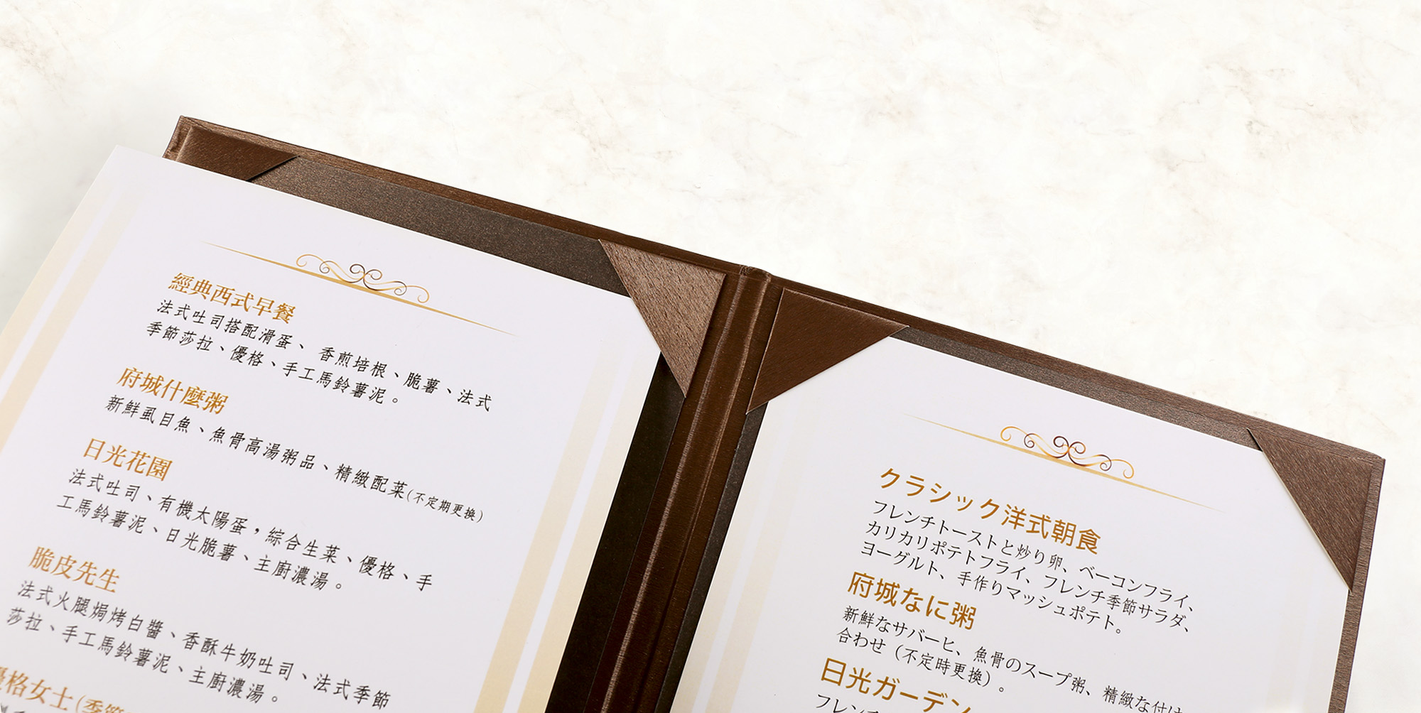 ▼咖啡色麗柔皮,燙霧金,菜單本與金箔隨著燈光變化,典雅風範量身打造。