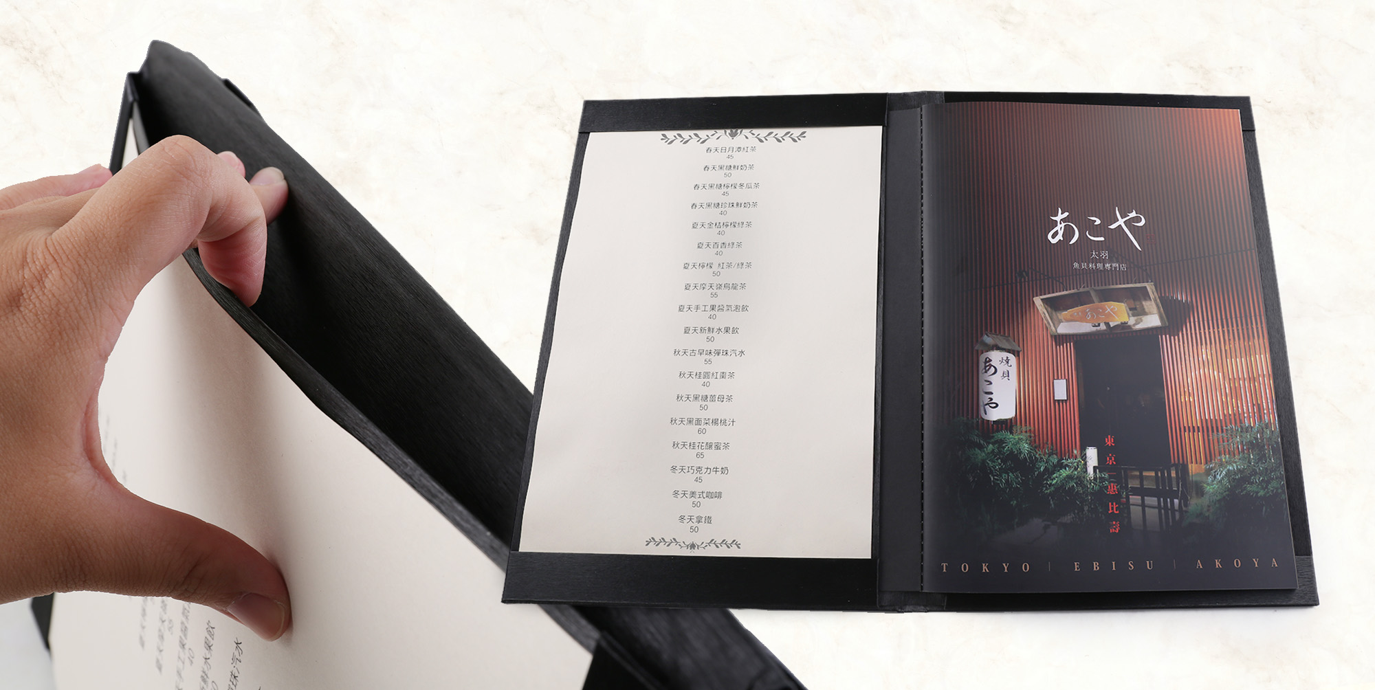 ▼ 菜單三合一,麗柔皮書套、單張內頁、書冊內頁