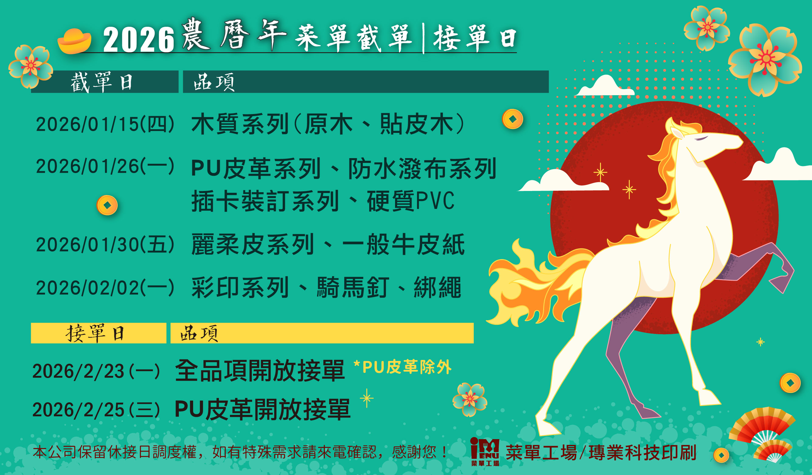 ,菜單將預計於過年後(10-15天)出貨;有製作菜單需求的朋友仍可填寫詢問單,過年前的報價程序將如常進行。