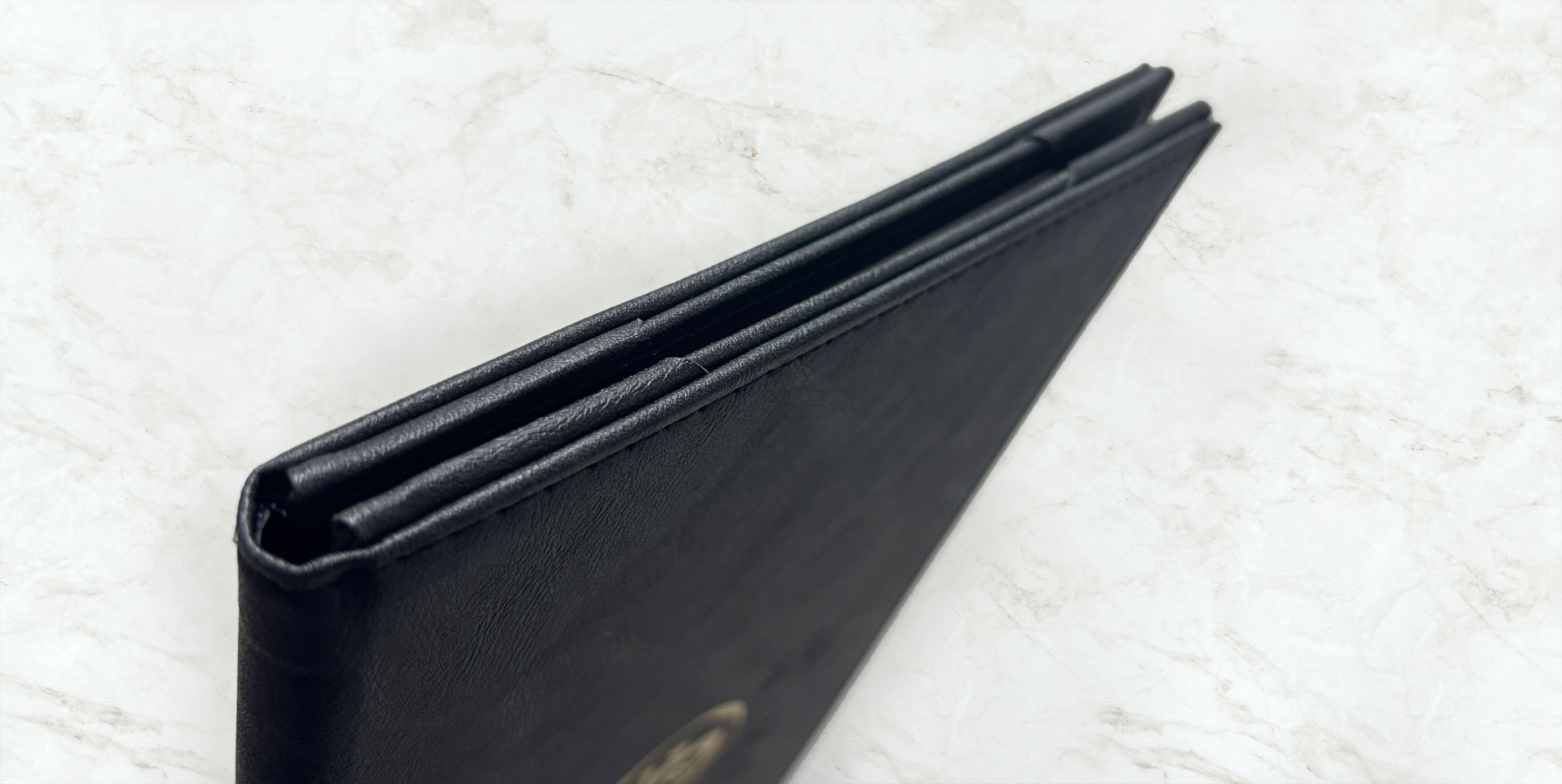 多層結構收邊平整,線條俐落,展現精裝菜單封面在細節上的完成度